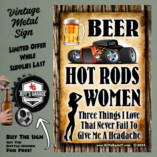 Beer, Hot Rods, Women - Three Things I Love #11 - 12" x 18" Vintage Metal Sign (Free Bottle Opener)