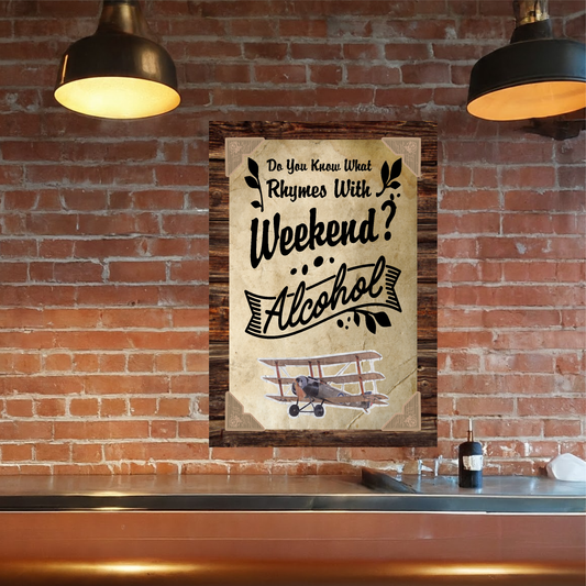 Do You Know What Rhymes With Weekend? Alcohol - 12" x 18" Vintage Metal Sign